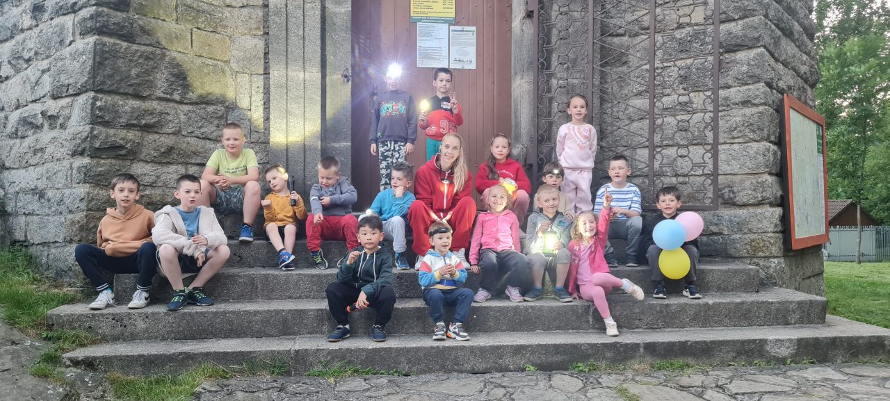 Když se začalo stmívat, děti, které měly přespávat v areálu kempu, se vybavené čelovkami a svítilnami vydaly na večerní dobrodružnou procházku. Jejím prvním cílem byla rozhledna na vrchu Háj, kterou v doprovodu pedagogů a několika rodičů zdolaly. Odměnou jim byly nádherné výhledy v záři zapadajícího slunce. Dále cesta pokračovala směrem k Lesmistrově stezce a napojila se na hlavní spojnici mezi sjezdovkami. To už padla opravdová tma a když se celá skupina vrátila do kempu, byla už úplná noc.