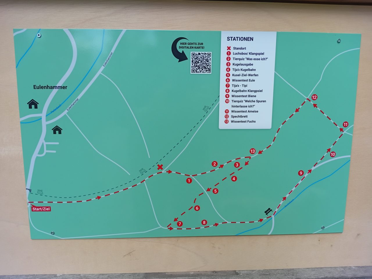 Návštěvníci se na stanovištích dozvědí zajímavosti o lesních zvířatech a jejich způsobu života, jednotlivé informační tabule jsou věnovány například sovám nebo netopýrům. Vyzkouší si svou obratnost a budou sledovat pohyb kuliček po několika drahách. Začátek stezky se nachází vedle železničního podjezdu na polní cestě mezi obcemi Fohrenreuth a Eulenhammer, je tedy snadno dostupný na kole po Perlenroute (Perlové cyklostezce).