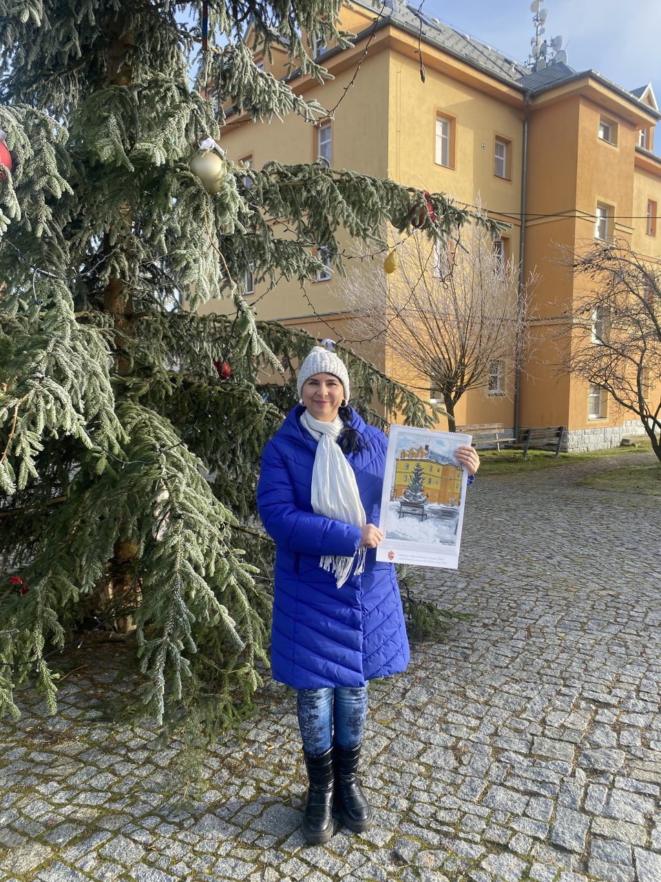 Petra Blaženková s kalendářem před jednou z budov, kterou namalovala