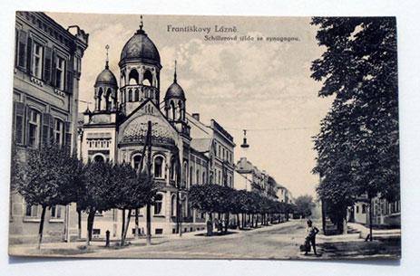 Židovská synagoga byla postavena v roce 1884 spolu s tzv. sanatoriem (lazaretem), a to v prostoru mezi současnou Americkou a Francouzskou ulicí. V současné době na místě najdeme pouze proluku, na protější straně potom synagogu připomíná pamětní deska. Synagoga byla vypálena během tzv. Křišťálové noci v listopadu 1938. Zůstalo z ní pouze obvodové zdivo.