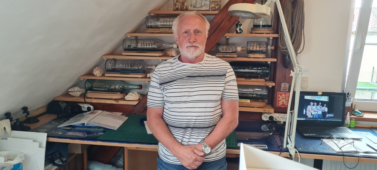 Od 12 let, takže nějakých 55 let. Dělal jsem také modely na vodu na motůrek. Bylo to metodou pokus omyl, tady v Aši nebyl žádný kroužek. První model v lahvi jsem viděl v časopisu Ohníček u článku, který se jmenoval Loď v lahvi. Bylo to o netrpělivém klukovi, kterému někdo radí, že má právě stavbou lodi v lahvi cvičit trpělivost. Hrozně se mi líbil ten obrázek.